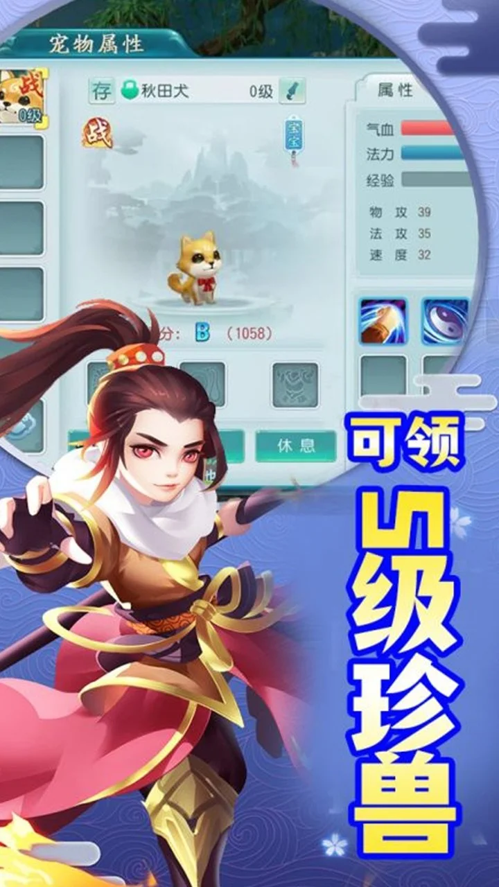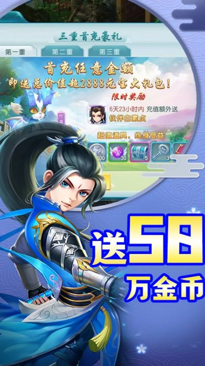 本游戏以神话题材为背景,历时两年,采用最流行的Q版风格打造出来的浪漫型网游。崭新的画风、风趣的对白、优良的系统设计、谨慎精密的 门派平衡、引人入胜的剧情任务贯穿整个游戏。福利:★上线福利:送10万元宝500万银币50万金币★首次充值可领S级珍兽,限时首充可领伙伴白素贞★连续登录可领伙伴 法海,宝宝机关兽,坐骑仙葫★商城礼包全面调整,让平民也能玩嗨!