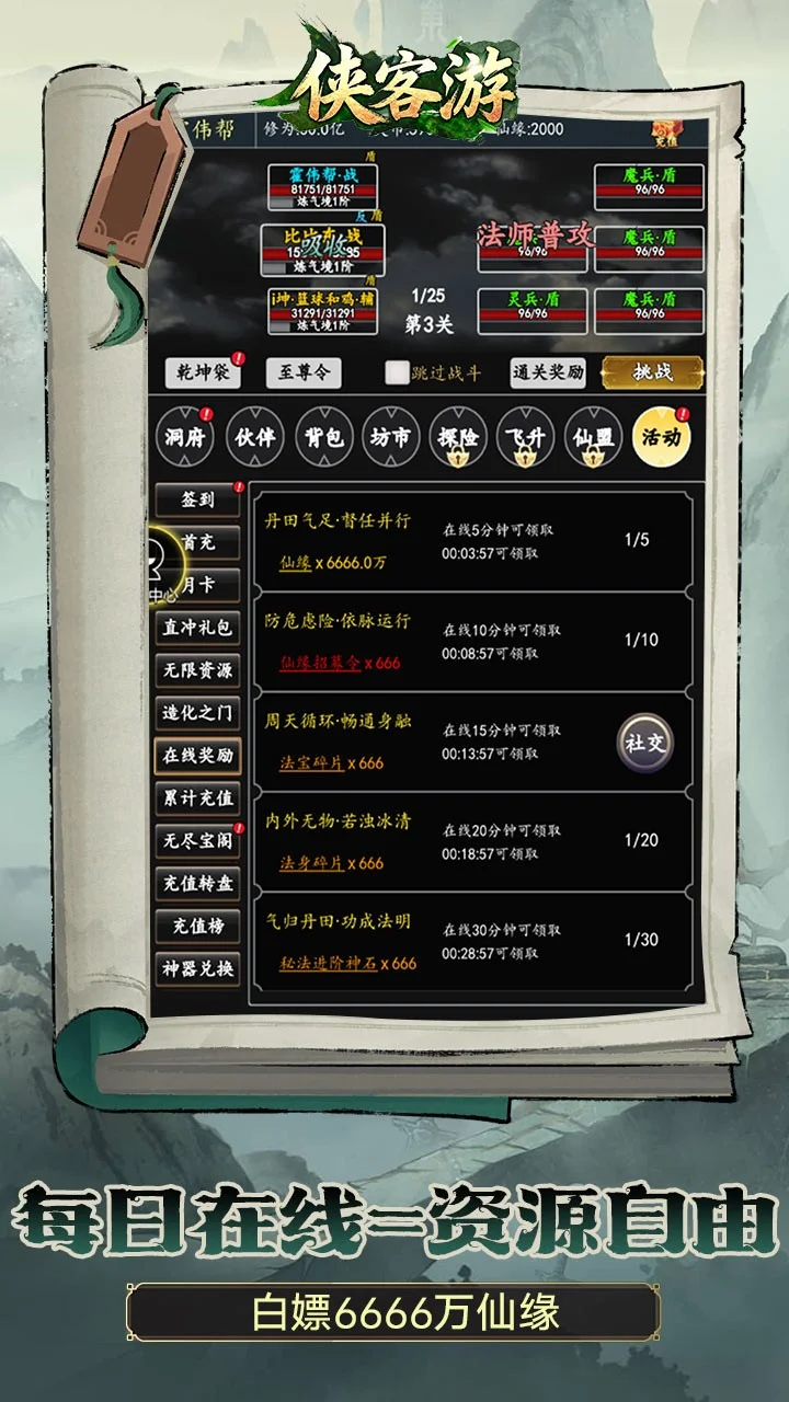 挂机在线=资源自由:每日领6666万仙缘+666招募令+海量碎片,填平修仙之路!