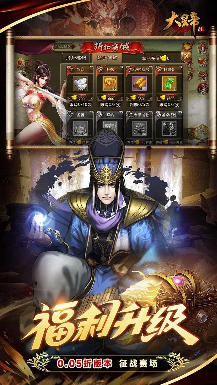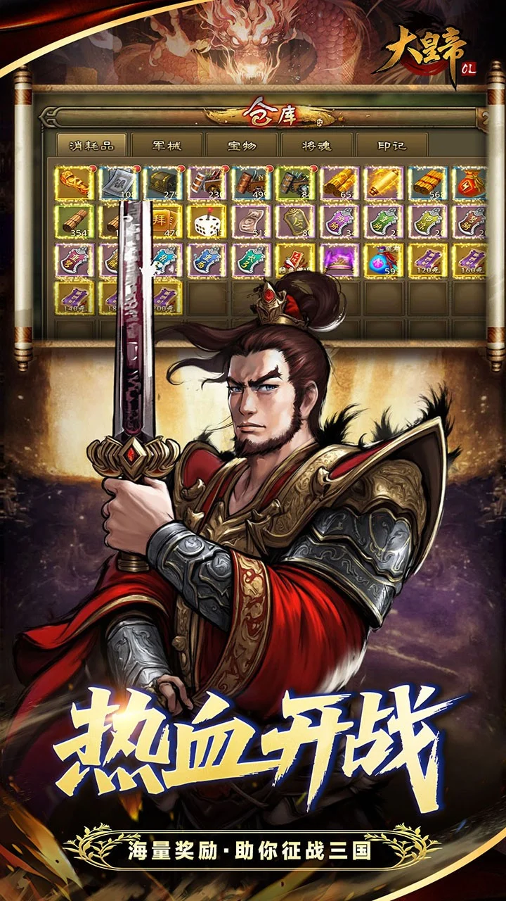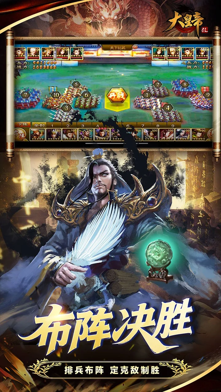 《大皇帝手游》一款为策略游戏用户量身定制的三国SLG。 128座城池,组建自己的势力,亲身参与东汉末年争夺天下霸权的三国征途!玩家亲临乱世汉末,击杀叛贼,临危受命,一举称帝,就此展开一条别样的三国帝王之路。 在《大皇帝OL》中,您可以不断地开疆扩土,收复更多的领地,每一座城池都能为您之后提供大量收益,英雄,银两,宝物通通在手! 问鼎江山还不够,成为最强帝王才是正道。 王者之巅,争夺积分名次,从草根组攀登至尊组;诸侯争霸,经历数轮淘汰,登顶全服帝王宝座。成为无数豪杰仰视的真正大皇帝!
