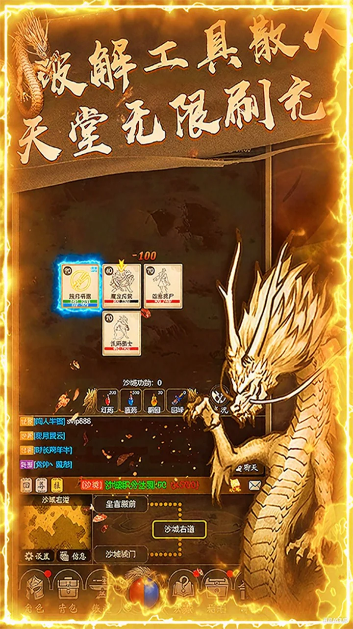 多场景的自由战斗比拼冒险,自动挂机享受到游戏激情的战斗比拼,游戏的操作并不会太难,而且有非常多不同的战斗方式供玩家自由的选择,每个玩家都能够在这里找到自己想要的战斗玩法,支持玩家随时随地进行挂机战斗比拼冒险,多场景的探索游玩享受到激情热血的传奇战斗,多方面的养成,成就一段绝世传奇。