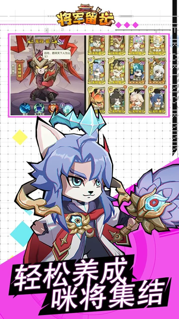 一款以三国时期为背景、画风Q版猫猫形象的策略卡牌手游。全新0.1折福利来袭,游戏内所有充值永久0.1折,游戏融合经典三国历史元素,玩家将进入到一个由 喵星人主宰的奇幻三国世界,在游戏中你将扮演一名主公,招募如忠勇无双的“赵云喵”、义薄云天的“关羽喵”、霸气侧漏的“吕布喵”,组建强大阵容。游戏采用回合制战 斗模式,玩家需根据武将属性和技能制定战术。游戏的玩法是经典的卡牌养成、对战玩法,也加入了运镖、跨服争霸、红颜等创新元素。