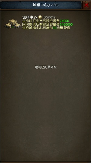 城镇中心:在城内空地块上建造,建造需消耗资源,建造有等待时间,消耗钻石可以秒掉等待时间,升级&建造建筑等待过程中需占用1个空间,空间=建筑位,升级资源不足时,允许直接使用钻石替代资源进行升级操作。