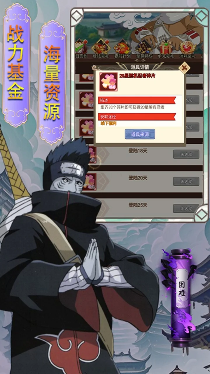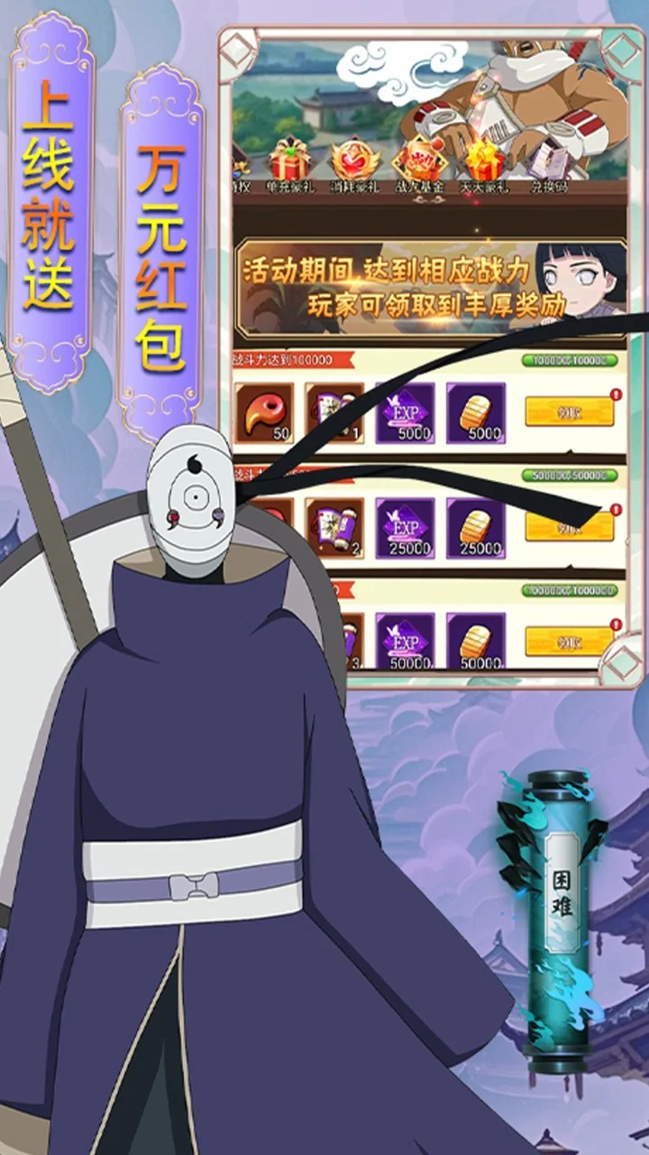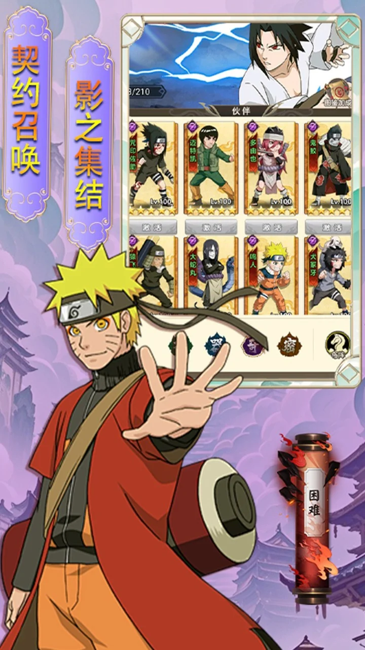 玩家可通过契约召唤,集结忍者完成冒险。收集奥义、忍者过关斩将。竖屏操作玩法更加简单,休闲挂机养成即可,既可以收集强力忍者和自己喜欢 的忍者,也可以想玩就玩,还不用费力操作做高玩,是喜欢火影和卡牌的玩家福音