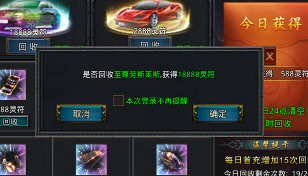 每日免费的回收次数为5次,若回收次数不足,可以通过每日首充增加15次回收次数。界面右边会显示当日已获得的灵符数量以及当前剩余的回收次数,请多多留意!