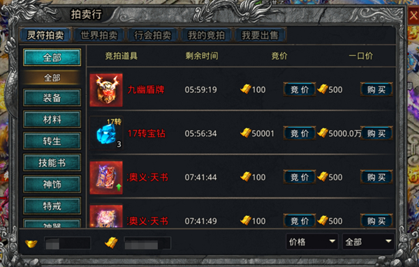 爆出的装备和道具多,留着占据背包和仓库,真是幸福的烦恼。如何有效利用不浪费呢?快来拍卖行,在这里,可以拍到各种各样的装备,材料,转生需要的道具,技能书,神饰,特戒,神器,魂器。有行会的兄弟还可在“行会拍卖”中,竞价特殊活动BOSS产出的稀有道具。