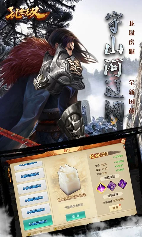 《乱世无双》是一款大型3DMMO国战手游。游戏围绕宋金乱世为主题,在山河破碎、家国沦陷的历史大局下,将传统文化与时尚青春元素相结合,给玩家再现可歌可泣、波澜壮阔的宋金大战。《乱世无双》在保留了传统国战的经典玩法同时,将国战场景直接搬到了世界地图,让国战战火真正的燃烧在游戏的每一个角落,热血指挥实时喊麦指挥,燃爆全场!游戏玩法丰富,国战、王帮战、跨服组队战、南蛮入侵、大乱斗等多种玩法等你体验!