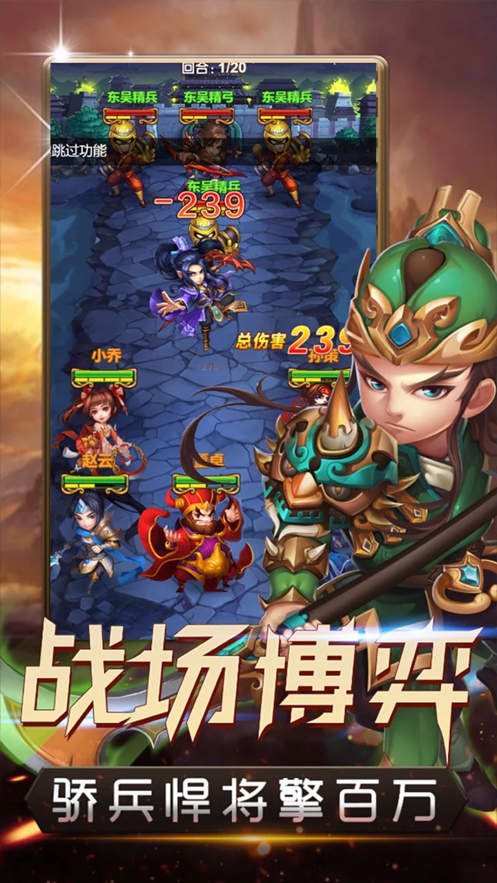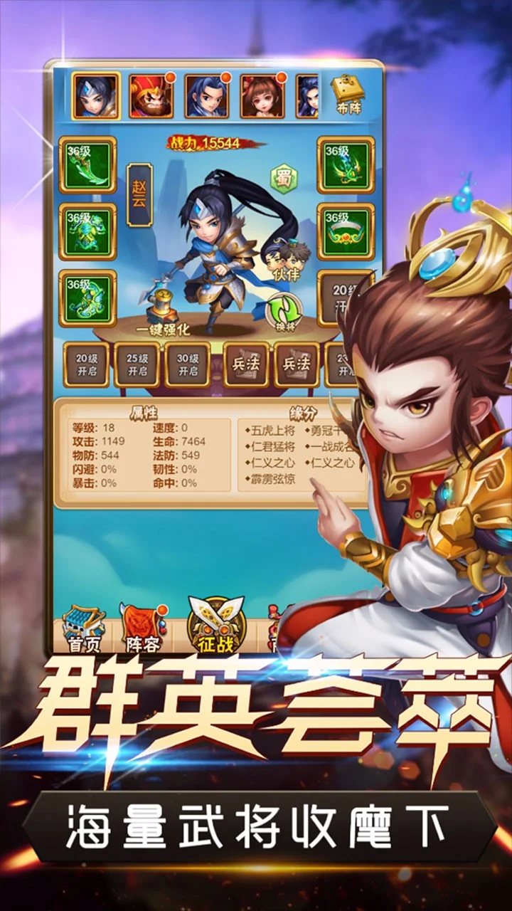 《冲啊三国》是一款小巧更有料的三国卡牌手游。百余知名三国武将沙场逐鹿,美人妖姬尽入掌中。三国名将,收集调教,组建属于你的军队,圆你一统三国梦!创意挂机频道,聊天嗨不停,鲜花、臭鸡蛋超多道具表心意!帮战国战,跨服竞技,原创奴役玩法,让你战个痛快! 过关斩将、南极仙塔多样玩法,卡牌巧妙搭配,百变阵容横扫三国!万人阵营大战,华丽武将技能、天赋技、组合技轮番登场,畅爽对决,群雄汇聚勇夺王座,成就盖世霸业!