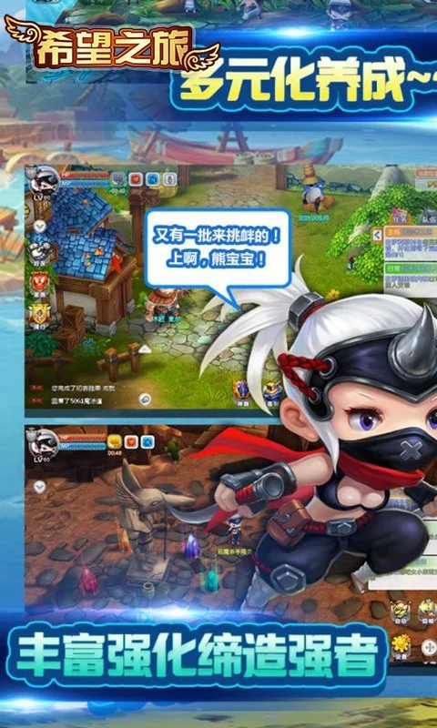 《希望之旅》是一款回合类游戏,包含浓郁的神话气息,精美的画面表现,酷炫的坐骑与翅膀系统,还有唯美的外观系统。其他还拥有神兵、法宝、宠物等各种轻松又强大的功能系统,让你每天都有不同的极致体验!游戏在掌中微操系统中做出了大胆有趣的创新,赋予了玩家最大限度的自由。玩家能自主掌控大招释放的方向、范围和时机,从而主动掌握局势,构建属于自己的大好形势。同时,游戏独有的召唤兽系统,更加丰富了玩家对于游戏战斗的体验。同样可以手动释放的召唤兽技能,不仅是对微操作环节的极佳补充,同时还是一场极致华丽的视觉盛宴。