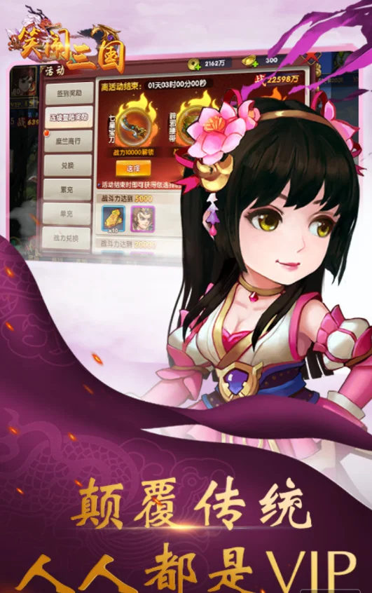梦三国超V版是一款三国背景题材卡牌RPG手机网络游戏,最新版本拥有更多武将!豪情相依,生死相伴,看浩然天地间,谁主沉浮!《梦三国超V版》还你一个最热血澎湃的时代!双主角的自由选择,炫酷夺目的技能特效,深度系统的武将培养,华丽震撼的视听享受,玩家仿佛穿越时空,重返群雄争霸、驰骋沙场的路途。全民VIP特权,强大的福利系统颠覆传统卡牌手游模式,真正让利玩家,给予玩家畅快淋漓的游戏体验。精彩纷呈的PVP活动,丰富多样的PK对决,轻松自如的好友聊天,让玩家在游戏中尽情享受互动的乐趣