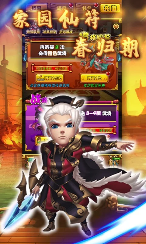 游戏以中国古典名著《三国演义》为背景,讲述在三国的乱世中,玩家可扮演主公的角色,招募三国时期的各种名将,来实现三国统一的梦想。游戏拥有招募武将、天命、阵法、真气等战斗培养元素,还引入竞技场、跨服竞赛、跨服巅峰等PVP玩法。