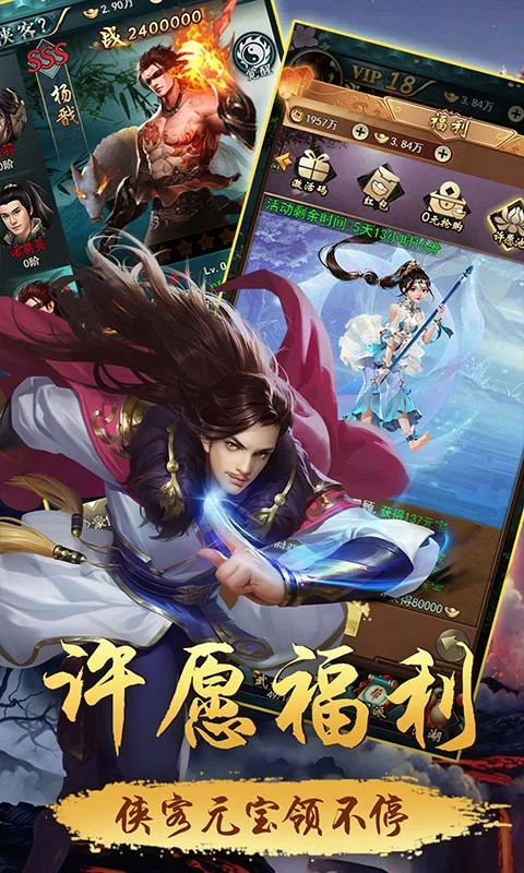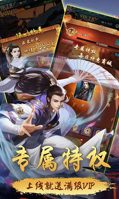 《江湖侠客令满V版》不同于一般武侠游戏惯用武侠小说人物作为NPC或招募角色,别树一帜的让历史中的人物向你传授各路绝学,和秦始皇修习王者剑法,和李白共舞青莲剑歌。万花宫、名剑山庄两大门派阵营,掌门争夺花落谁家?与红颜双修缠绵,收益加成大幅提升。更有炫丽的时装灵物等百种外观,圣殿、阴阳阁、天外江湖等诸多有趣玩法,与你共创精彩的武侠世界。