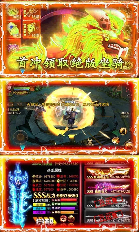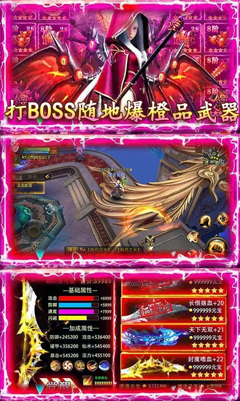 全新职业 大显神通 酷炫技能 闪耀登场 上线就送满V和绑元*88888、金币888W、100元充值卡和称号,次日登陆送328充值,七天登陆领海量元宝及648充值卡!个性套装 清爽登场 彰显自我 秀出风采,酷炫坐骑 巡视四方 制霸之路 只需一步!狂打BOSS 横扫洪荒 侠士作伴生死与共 完成活跃及在线挂机也可领取充值卡!无限商城0元开启!首冲领取橙品武器及绝版坐骑,首次充值额外赠送1倍元宝,最高额外赠送2倍。宝座抢夺 英雄神通 执剑傲临众仙之巅,热血激战 团战PK 跨服之战邀你前来!神仙眷侣 喜结良缘 江山美人 共拥入怀。