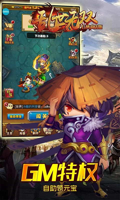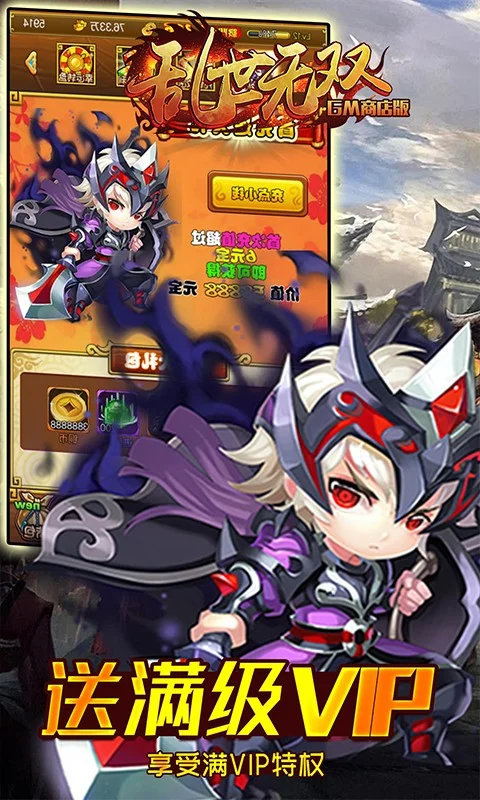 游戏内上线送满v,送15000金判,送武将。开通GM权限后,在GM商店里面每天可以免费拿海量金判,顶级红色武将等等海量道具。《乱世无双gm商店版》是一款以酷炫战斗为主打的二次元RPG立体卡牌手游,包含一百多名风格独特的英雄人物模型,以三国故事为背景,颠覆传统美术极限,经百名画师之手,每名武将都具有其独特的外观。加之特殊的羁绊关系,大气的蓬勃的合击技能,予以玩家荡气回肠的战斗破敌快感。