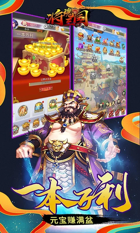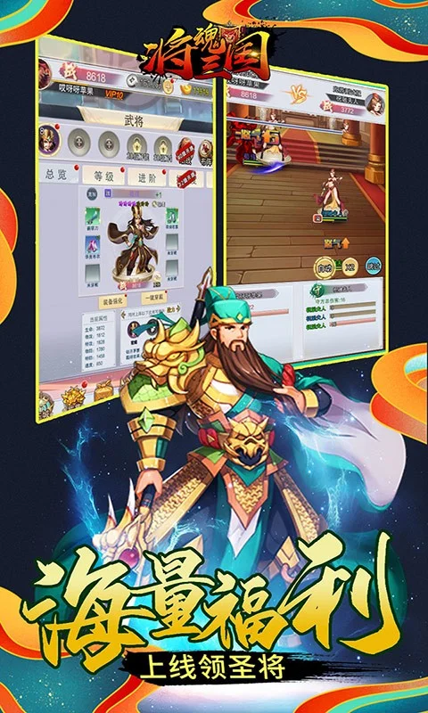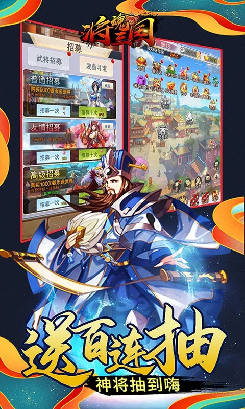 《将魂三国》是一款以三国背景的放置类卡牌游戏,游戏中有着独创的【九州】玩法,带领你领略不一样的三国魅力,游戏拥有着丰富的养成系统,转生、进阶等多种养成玩法,让你的武将随着不断进化成长。游戏内众多的三国英雄,以及每个英雄精心设计的技能,让战斗告别单一的碰撞,带来酷炫的视觉体验。多种多样的历练玩法,武道大会、宝矿争夺、三国霸主擂台,与其他玩家一较高下争夺珍稀资源。