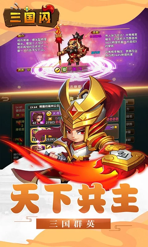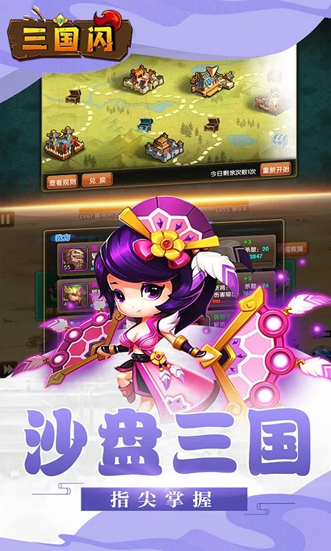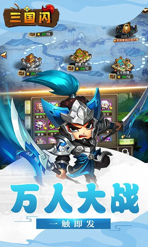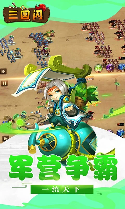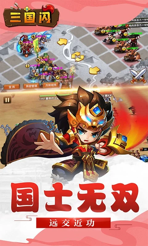 《三国闪》是一款三国题材的卡牌策略手机游戏,它的主要特点是军团作战,横版对冲,强调布阵策略和临场技能释放,让你淋漓尽致的体验指挥千军万马的大将之风,秒杀以往枯燥乏味的自动战斗模式。玩家可以率领40来个各具特色的史诗英雄,包含几百种武将技能,指挥300名以上的单位同屏厮杀,缔造“军团对战”的史诗感。能感受到“一夫当关,万夫莫开”,“大将冲锋,如入无人之境”的爽感。游戏提供丰富的成长系统提升玩家战斗力,更有宝物道具助玩家一臂之力。