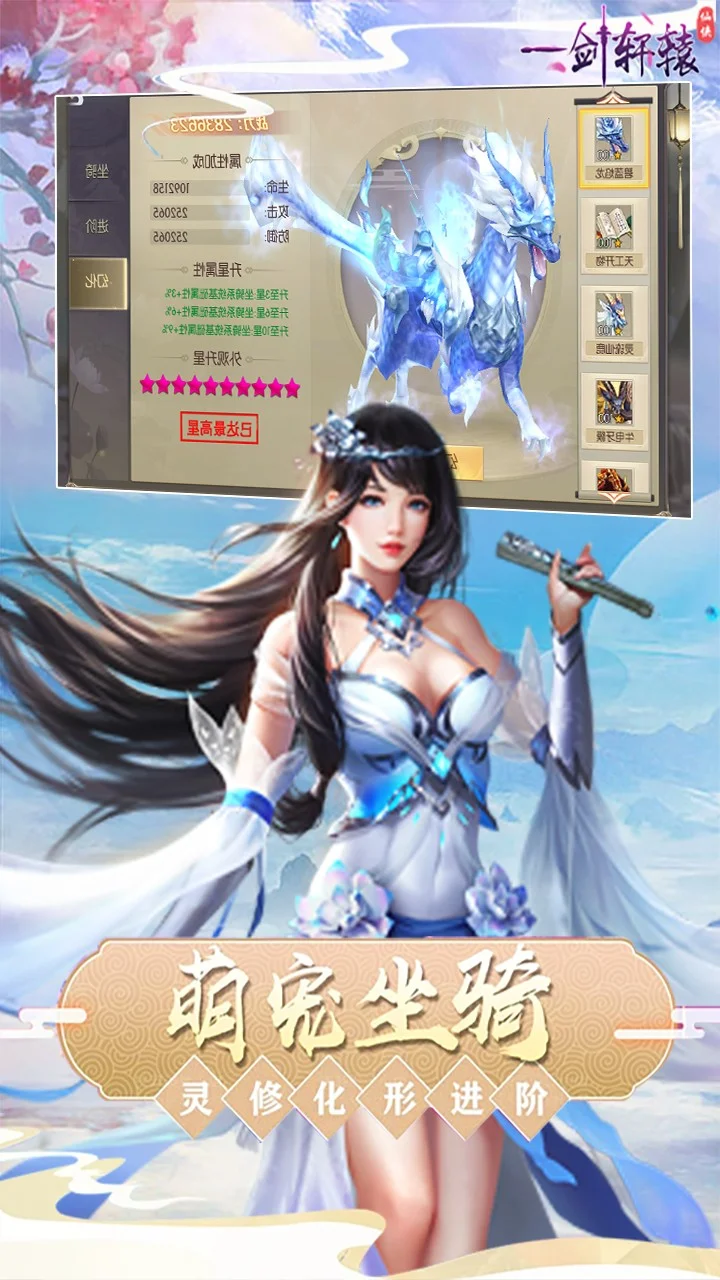 《一剑轩辕》一款清逸国风修仙问道RPG手游,游戏参考同名电视剧《轩辕剑》和山海经等众多古代神话,还原打造华丽细致的太古灵域场景,更设计美轮美奂的古神话风格时装、神兽、宠物,让你尽情体验这个充满古老和奇幻气息的神话,战斗感震撼十足,邀你一起来战! 特色副本,超多玩法,极高掉率,满级神装不再是梦! 百变造型:灵童萌宠,精美时装,酷炫造型任意搭配! 酷炫坐骑:坐骑多种,神龙凤凰,神兽与你并肩作战!天赐良缘:缘定三生,结婚生娃,携手同游永不孤单