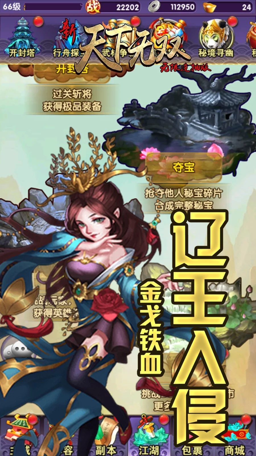 《新天下无双无限连抽版》是一款武侠题材的养成卡牌冒险RPG手游。游戏巧妙将Q萌版绘画和经典武侠故事情节结合,融合策略、经营、养成和回合制战斗游戏特点,带给玩家全方位的卡牌游戏享受!