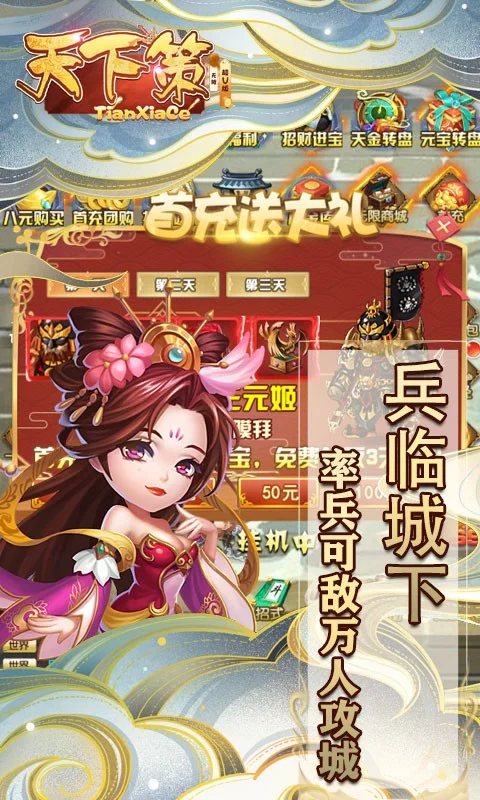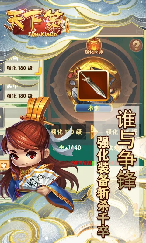 《天下策无限超V版》是一款以三国乱世为背景打造的回合类挂机手游,游戏以Q版武将形象和简单的操作为大家再次描绘一个不一样的三国。各位玩家在游戏中可以使用各个著名的三国人物,来组建自己的队伍。玩法上不仅有精心设计的地图关卡,过关斩将的经典战役,更有丰富的PVP玩法和实时的玩家对战,演绎各自心中最喜欢的三国战场。武将更可以通过升级、培养、超进阶等方法,自由打造最强武将,随心搭配阵容。各种组合千变万化,众多强大的三国武将等你来招募,率领你的军队击败众多对手,实现你的雄心壮志!