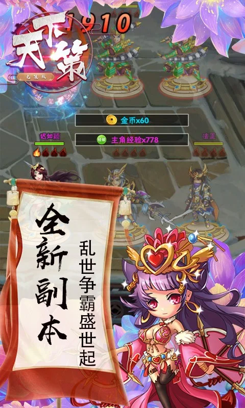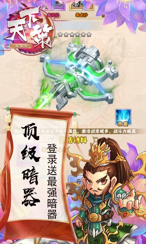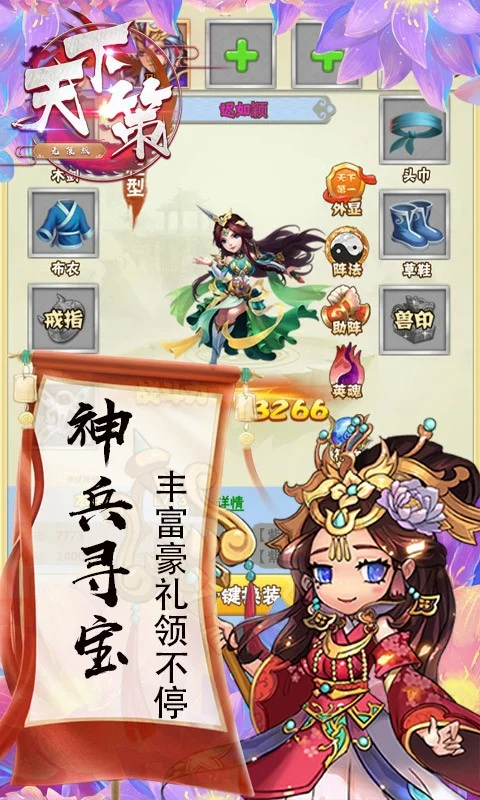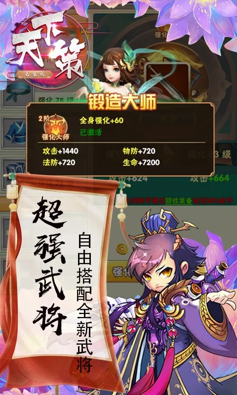 《天下策无限版》是一款以三国乱世为背景打造的回合类挂机手游,游戏以Q版武将形象和简单的操作为大家再次描绘一个不一样的三国。各位玩家在游戏中可以使用各个著名的三国人物,来组建自己的队伍。玩法上不仅有精心设计的地图关卡,过关斩将的经典战役,更有丰富的PVP玩法和实时的玩家对战,演绎各自心中最喜欢的三国战场。武将更可以通过升级、培养、超进阶等方法,自由打造最强武将,随心搭配阵容。各种组合千变万化,众多强大的三国武将等你来招募,率领你的军队击败众多对手,实现你的雄心壮志!