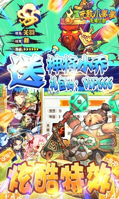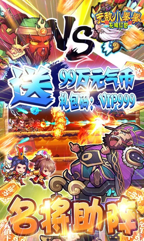 上线送648充值、送99万元气币(礼包码VIP999) 送神将小乔(礼包码VIP666) 送功夫熊猫(礼包码VIP888)。《无敌小拳拳-无限红包版》是一款角色扮演三国题材的跑酷射击游戏,这款游戏中你会遇到各种各样的武将,游戏中的笑点满满,为你带来一个不一样的三国,男女主角穿越异世遭遇Q萌三国,外星乱入复制绝世名将,抢走玉玺密谋控制这个可爱的星球,深山野岭青春小妹麽麽哒。啼笑皆非逗逼故事,另类剧情假期闹翻天!