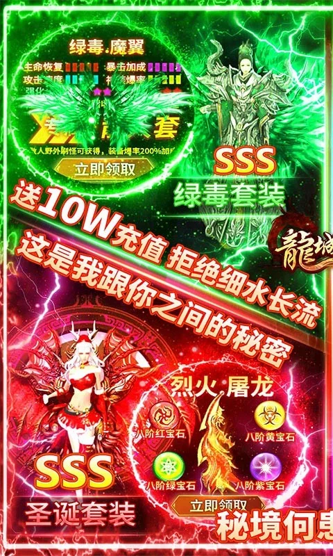 龙城秘境送10万元充值卡,增加对应的钻石至尊VIP经验值,可激活每天累充和福利累计充值,如获珍宝,一款独创1秒99刀,刀刀加速,百倍爆率,所有装备,所有特殊以及材料游戏内全部能爆,主线一点,1秒99刀,直飞100级,开局金灿灿不是梦,上线直接开打,VIP礼包免费送,从Vip1送到Vip15,福利从初一送到十五!