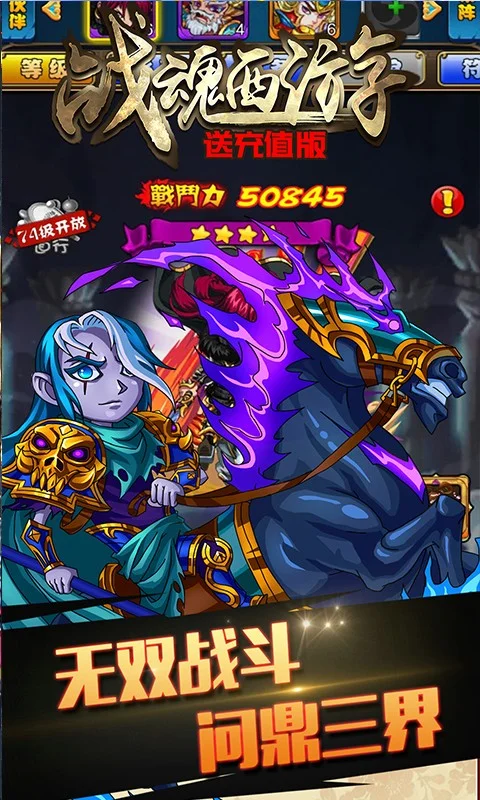游戏上线送vip,升级送充值卡,超千元充值卡等你来。《战魂西游送充值版》是一款Q版西游策略卡牌手游!炫酷超萌的神兽,无坚不摧的神器,出身入化的神话武功彰显玩家实力。丰富卡牌联动,人物缘分加成搭配超强合击技能,突破单一卡牌限制,带来爽快打击。易容、铸鼎、天象星命、秘宝精炼等特色玩法带来更强战力。刺激的帮派玩家竞争,轻松的模式,丰富精彩的闯关还有更多玩法满足玩家的各种需求。