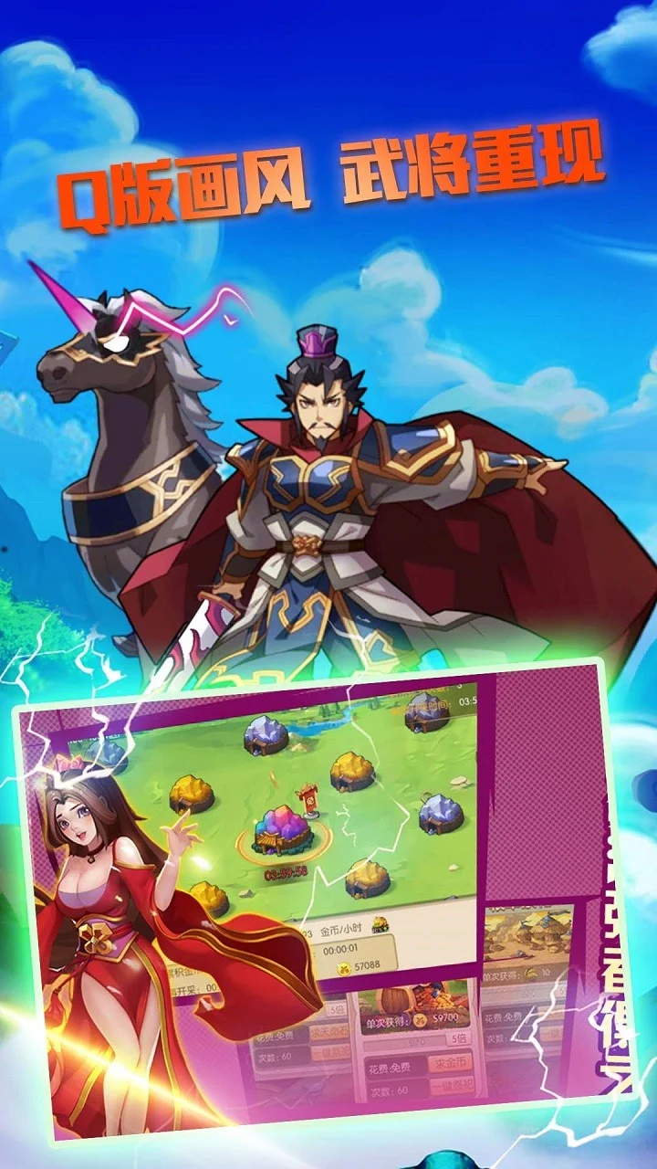 《三国霸》是一款卡牌收集类游戏,游戏美术风格Q萌。星际掉落10枚陨石,化作力量无穷的神兽玉玺,掉落各个州郡,谁能收集齐这10枚玉玺便能获得无上神力,主宰三国。游戏将瑞兽元素融入到三国题材中,加上颠覆性无节操剧情,给玩家带来与众不同的体验。游戏中独创骑战玩法进一步加大了战场的不确定性。众多武将一一登场,更融入大量瑞兽元素,让每个武将都能骑乘驯服的瑞兽一同作战,让玩家在瑞兽的帮助下体验微型战争的乐趣。国战,军团战,跨服个人战,你想要的PK都在里面,应有尽有,来开启属于你的王朝吧。