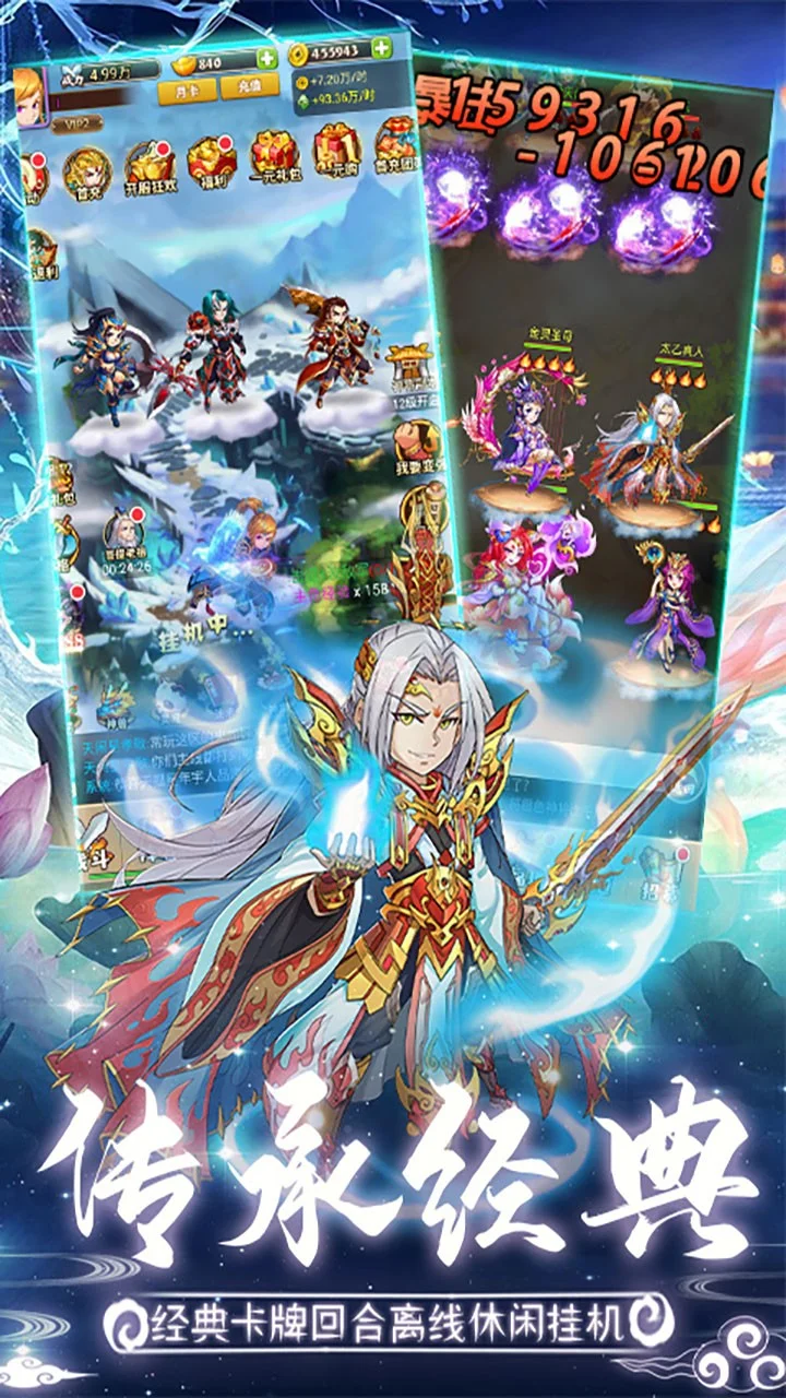 《问鼎封神送神将》结合了封神卡牌成长、战斗与休闲挂机的养成体验,玩家不仅能体验到传统卡牌游戏中的策略和养成元素,又能通过挂机自动PK来实现角色成长。游戏以淡水粉色调的画面还原了封神时期的古朴氛围,同时以2D化Q版漫画风格和流畅的骨骼动画对封神名将进行更加细致的刻画。通过收集阐教、截教、人道、奇能的各类神将,获得各类仙器、法宝和灵宠,