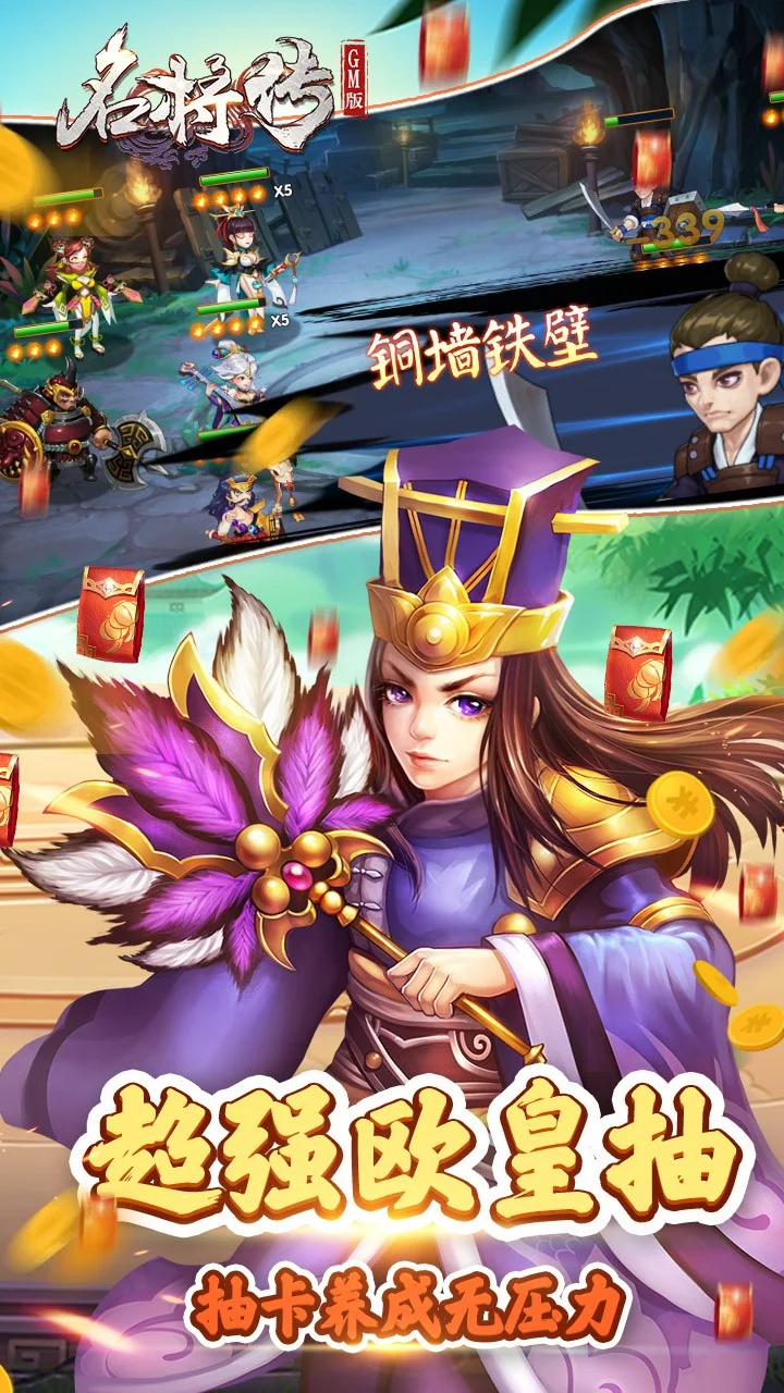 《名将传GM版无限元宝》是以三国作题材的一款三国卡牌手游,游戏中玩家将扮演主公,招募良才勇将,完善的装备锻造,强化,兵书修炼,为您的装备添金加银,技能满屏炫酷,一招制敌,以一敌百,24小时不停歇打怪升级,操作简单易上手,只需手指点击屏幕即可嗨战三天三夜不停歇!