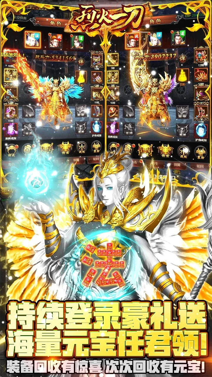 登录就送VIP15,元宝10w,金币500w,一套自选职业神装!一刀可屠龙。全民boss大狂欢,杀BOSS得充值,击杀送充,最高可得万元充值卡!首充返利大升级,最高可得十倍元宝,还有神兽麒麟,无级别神装,秘籍三分归元气,涅槃火羽等豪礼等你来拿!更可获得金币buff特权!VIP礼包免费领取,传世神装、金色战纹、五阶官印、红色图谱,领你想要!装备回收有惊喜,次次回收有元宝!持续登录豪礼送,海量转生丹、橙色图鉴、神装碎片、元宝任君领取!超值月卡特权升级,购买不仅可领多倍元宝,更有专属BOSS、挂机加成等特权专享!
