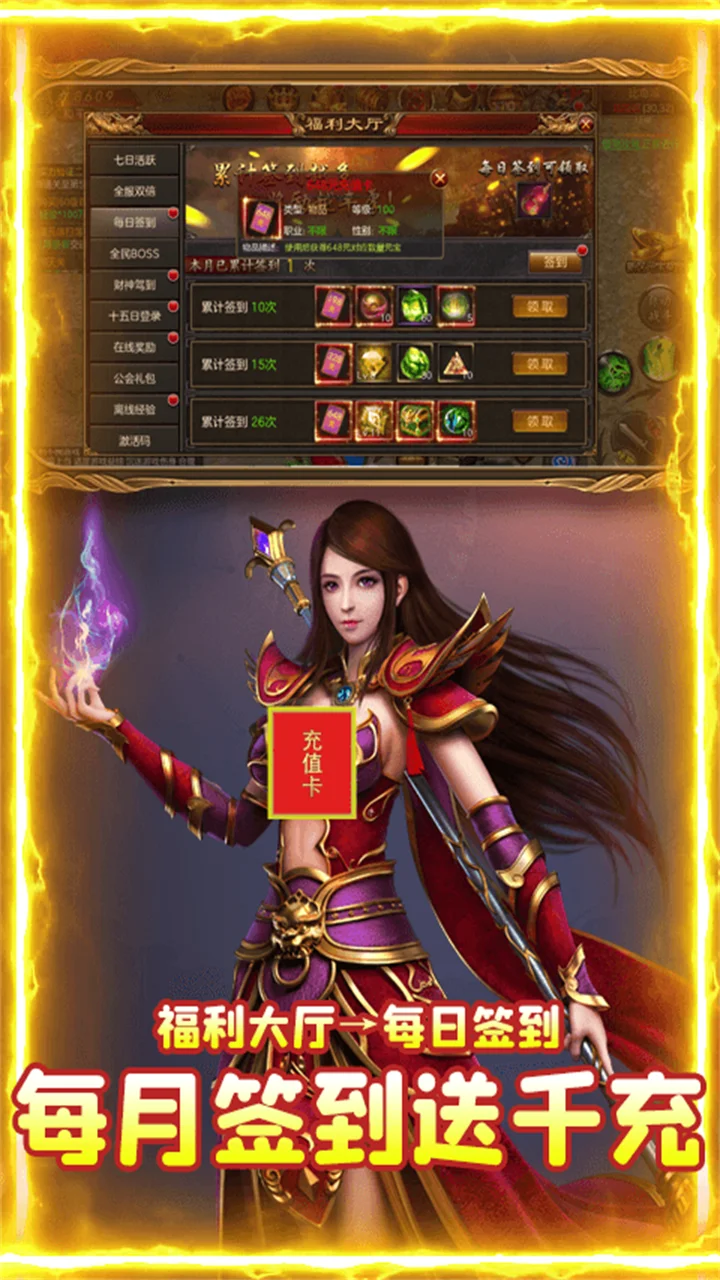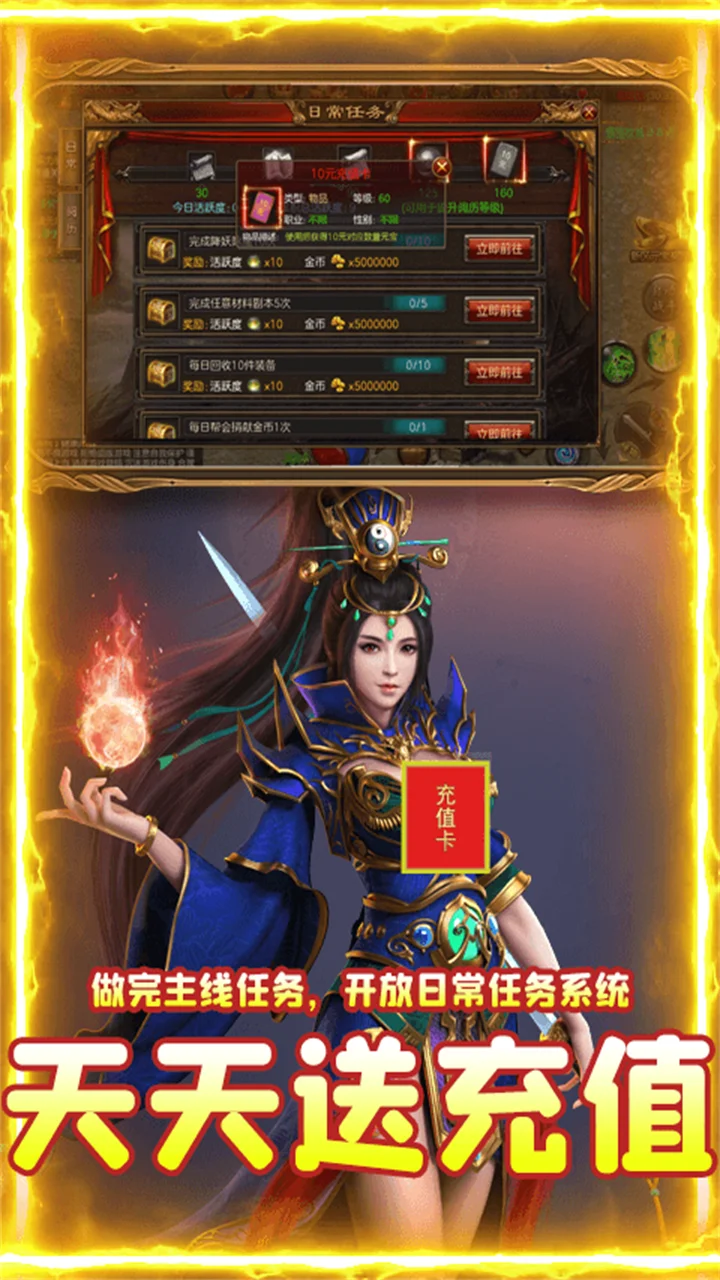 创角送VIP3,68888元宝,9999999金币,以及千元充值卡宝箱!日常任务天天送充值,每月签到更送千元充值卡!《大都督(天天送充值)》是一款集MMO与RPG为一体的全新大型传奇手游。原版复刻端游经典设定,战法道三职业、打宝、自由PK、血战红名、爆装、热血攻沙,指间驰骋经典传奇!