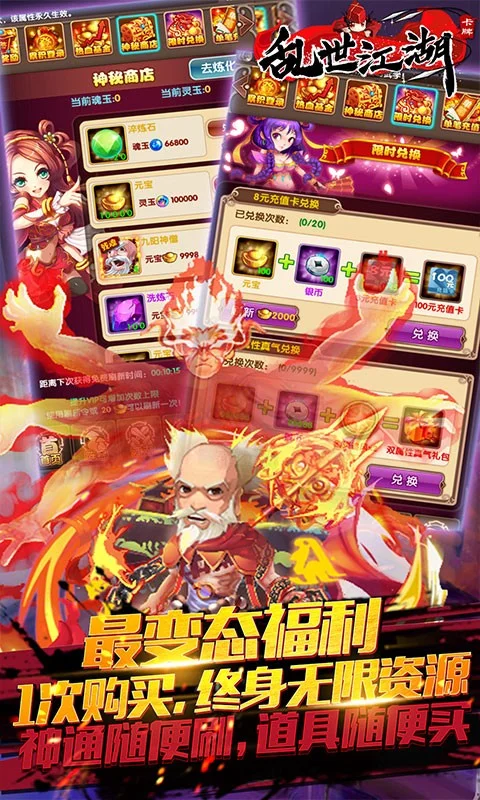 《乱世江湖(无限资源版)》巅峰武侠卡牌巨制,新版本独家增加1元商城,所有道具都直接1元购买,商城购买元宝更是10倍购买,还有独家真充值卡系统,升级送充值,登录送充值,所有充值活动全激活,无限资源1次购买终身享受,21亿元宝花到你想吐,只为让玩家玩的尽兴!2021首选武侠策略卡牌手游,国手级原画师打造高精度武侠题材策略卡牌游戏;致敬热血经典武侠世界,一级高端影视特效,暴爽画面冲击感,畅享扣人心弦的极致对战体验,勾起你不羁的剑侠情怀。