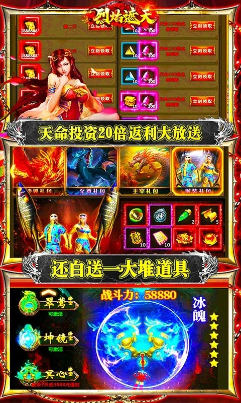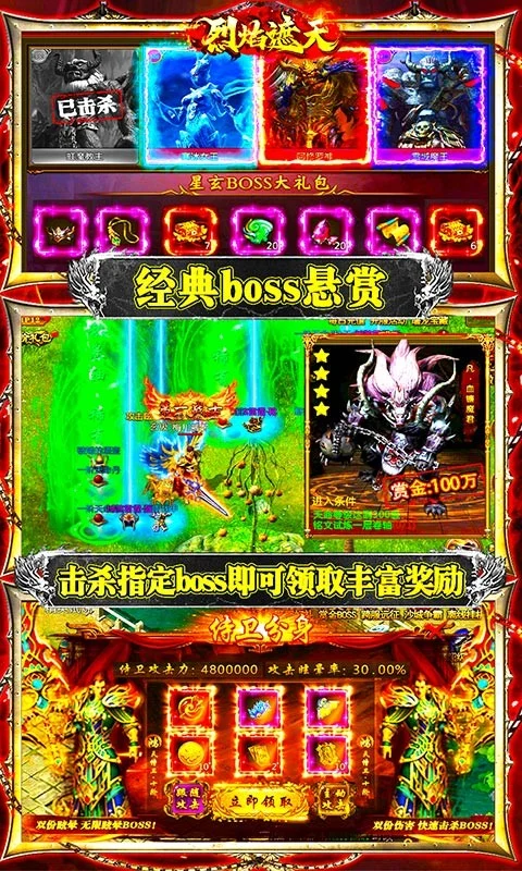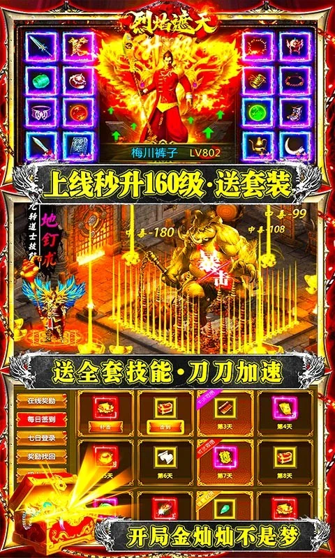 烈焰遮天迷失贺岁版:上线赠送福利钻石10W、绑定元宝500W、VIP10,经典boss悬赏,击杀指定boss即可领取丰富奖励,主线一点,直飞160级,刀刀加速,开局金灿灿不是梦,首充送绝版称号“原汁原味单职业”,还有神兵武器等你来拿!