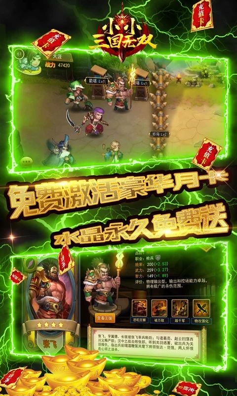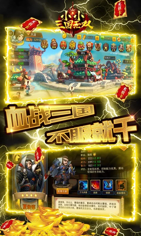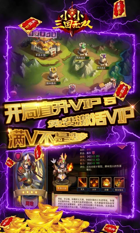 跨服争霸,丰厚奖励,三国王者,巅峰对决!作为一款三国攻防战略卡牌手游,《小小三国无双天天送真充》颠覆传统策略游戏玩法,集合卡牌、养成、塔防、战略等多个元素打造掌上三国超爽策略战场!阵容搭配、城防建设、资源掠夺、跨服PK真实还原三国沙场烽火连天!想要成为三国霸主吗?赶快放马来战吧!现在登陆游戏即送VIP5,真充值卡天天送,免费提升VIP,助你三国梦!