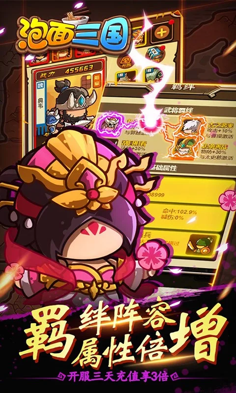 《泡面三国畅玩版本》是一款Q萌卡通、诙谐幽默的三国题材卡牌放置挂机手游。相信每一位玩家小时候都有买泡面抽卡的经历,开到珍稀三国武将卡必然是最开心的时刻,泡面三国完美复刻了这种儿时情怀体验。游戏还加入了放置挂机玩法,每天轻松挂机,开启泡面收集武将,闯关攻打城池,离线获得百倍资源收益,体验随时随刻穿越回古代开启一统三国的征程。游戏里还有数十种培养组合路线、组队模式、跨服盟战等内容,上线就送稀有武将,最后已准备高额福利等待主公随时领取!