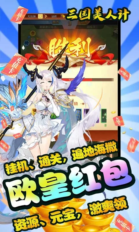 这是款倾心制作的挂机三国卡牌游戏。经典三国背景,全员娘化,超高品质极致立绘,带给你极致的视觉冲击和精神满足!各具特色的羁绊系统与海量萌娘武将,让你随心配队,突破阵容极限,释放策略合击;橙将、红将、金将送!送!!送!!!超豪华阵容轻松推图;资产过亿,福利百万,让你体验史上最无忧之开局;GM福利高高挂,充点小钱即可的无限资源,养成、财富、资源从此作用金山银山;海量红包,狂撒赠送,挂机、通关即可获得海量红包,元宝、神将,唾手可得;特色家园系统,为主公的王图霸业添砖加瓦!