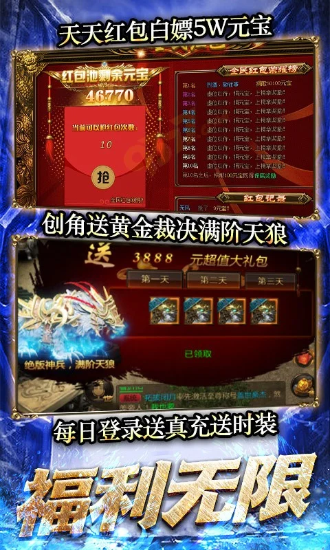 《龙城传奇超变合击版》是一款复刻电脑端传奇经典玩法,加入深度超变改版的传奇题材手游。登录即送VIP7,连登7天领5000次寻宝最高出终极,首充礼包免费送,领全职业通用黄金裁决、满阶天狼,升级可领万元充值卡,每日抢5W元宝红包,天天登录领真充领时装,三职业修正平衡,高智能挂机刷怪,小怪掉终极装备,全地图开放红名PK,每周一三五8点激情攻沙,不充值也能爽玩一整年。