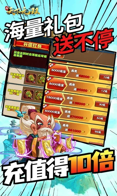 《新天下无双(至尊2万充)》是一款以三国为背景的经典卡牌游戏,讲述在三国的乱世中,玩家可扮演主公的角色,招募三国时期的各种名将,来实现三国统一的梦想。游戏拥有招募武将、养成、合击、化身等战斗培养元素,还引入竞技场、跨服竞赛、跨服巅峰等PVP玩法。上线就送百连抽,游戏各种福利赠送连抽奖励,简单来说,就是抽到“爽”!!!