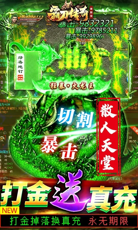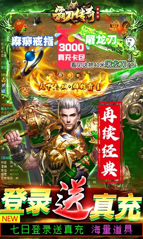 《霸刀传奇(万充毕业号)》是一款以即时PVP为核心的超人气单职业传奇手游,主线赠3000真充,贵族12纵享飞跃提升,让你体验毕业的感觉,签到,在线,登陆送真充、古玉等稀有道具,元宝花不完,战力猛提升。战斗新体验,开启爽快激斗新感觉。最强召唤师之路,等你来谱写!