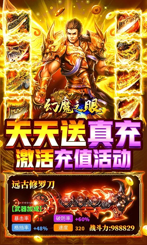 《幻魔之眼(开局GM装)》开局送GM武器-屠龙刀,开局秒怪;在线送真充,激活线上充值活动,真诚无套路,人人当霸主,0氪散人首选!真复古,真金币版,无VIP,重温当年快感;同时,创新文字传奇模式,放置挂机,回收金币,上班也能轻松玩耍。老兵集合的号角已经响起,携手兄弟再次重走传奇路,用手里的屠龙宝刀告诉世人,我还能战!