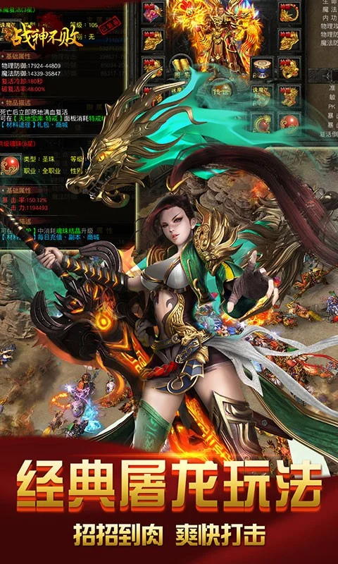 《战神不败》是一款写实风格,以传奇为题材的角色扮演类手机网络游戏,在PVP上有多种不同的玩法,玩家可以尽情的体验与他人进行战斗的爽快体验,还能与自己的兄弟共同征战,捍卫尊严,以不屈之志,灭天下之敌。正版公益传奇手游,颠覆你对传奇的固有看法!单职业设定,公平开局,杀怪装备全回收,红包免费送,单刷一切BOSS,兄弟结义真情永恒!同时完美还原端游经典玩法,真正不可多得的良心传奇手游,不试试看怎么知道好不好玩。