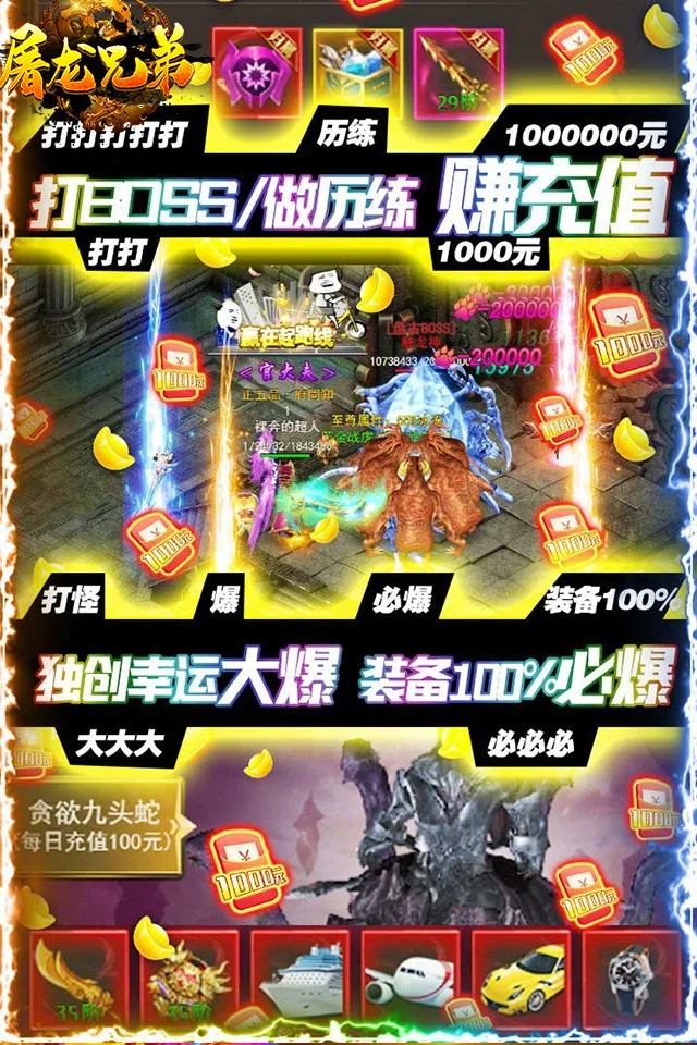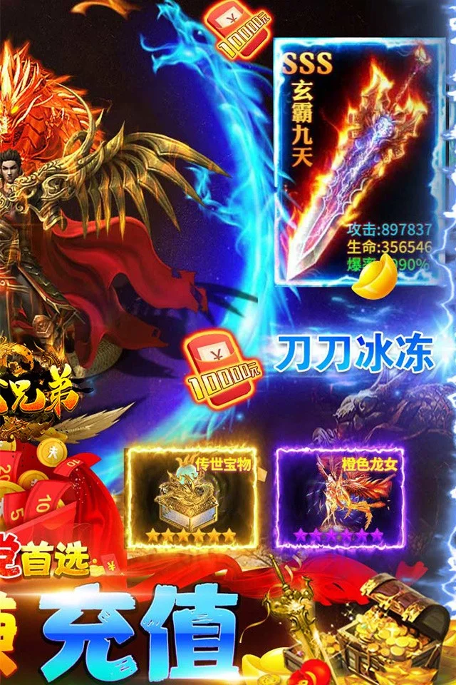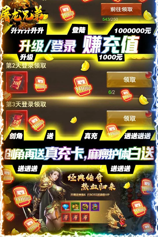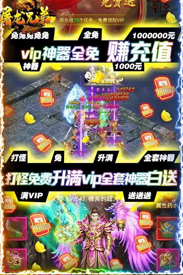 《屠龙兄弟》(0元赚充值)是一款0元党首选,融合战、法、道一体的单职业即时战斗传奇巨作! 首款真正0充赚充值的良心手游,首日在线送充值、升级送充值、登录送充值、免费提升vip送充值、击杀指定BOSS送充值、活跃历练送充值,创角再送海量真充卡,真正0元白赚充值! 经典传奇,创新升级,融合战、法、道于一体的单职业,刀刀冰冻、刀刀切割、一刀99999秒升级,独特又简单快捷的竖版即时制战斗模式,PK操作感更强更爽!永久免费回收钻石功能,独创的幸运大爆机制,装备100%必爆,酷炫战宠、超萌灵宠、绝美女神,带你进入复古而又别样的玛法大陆!