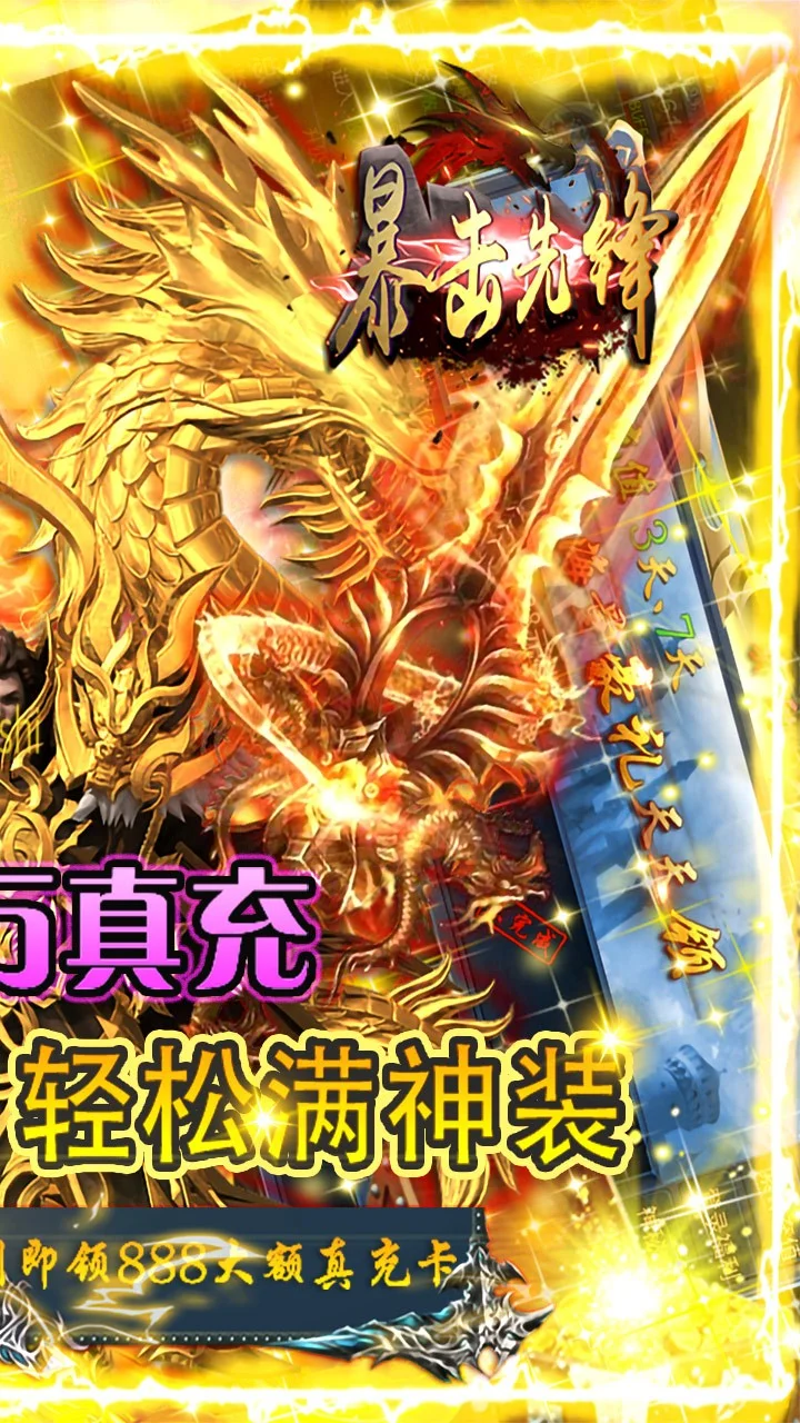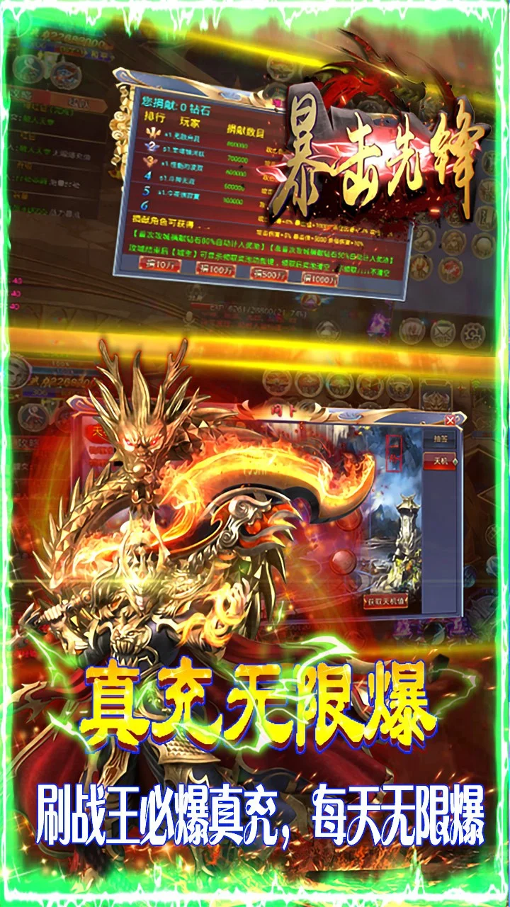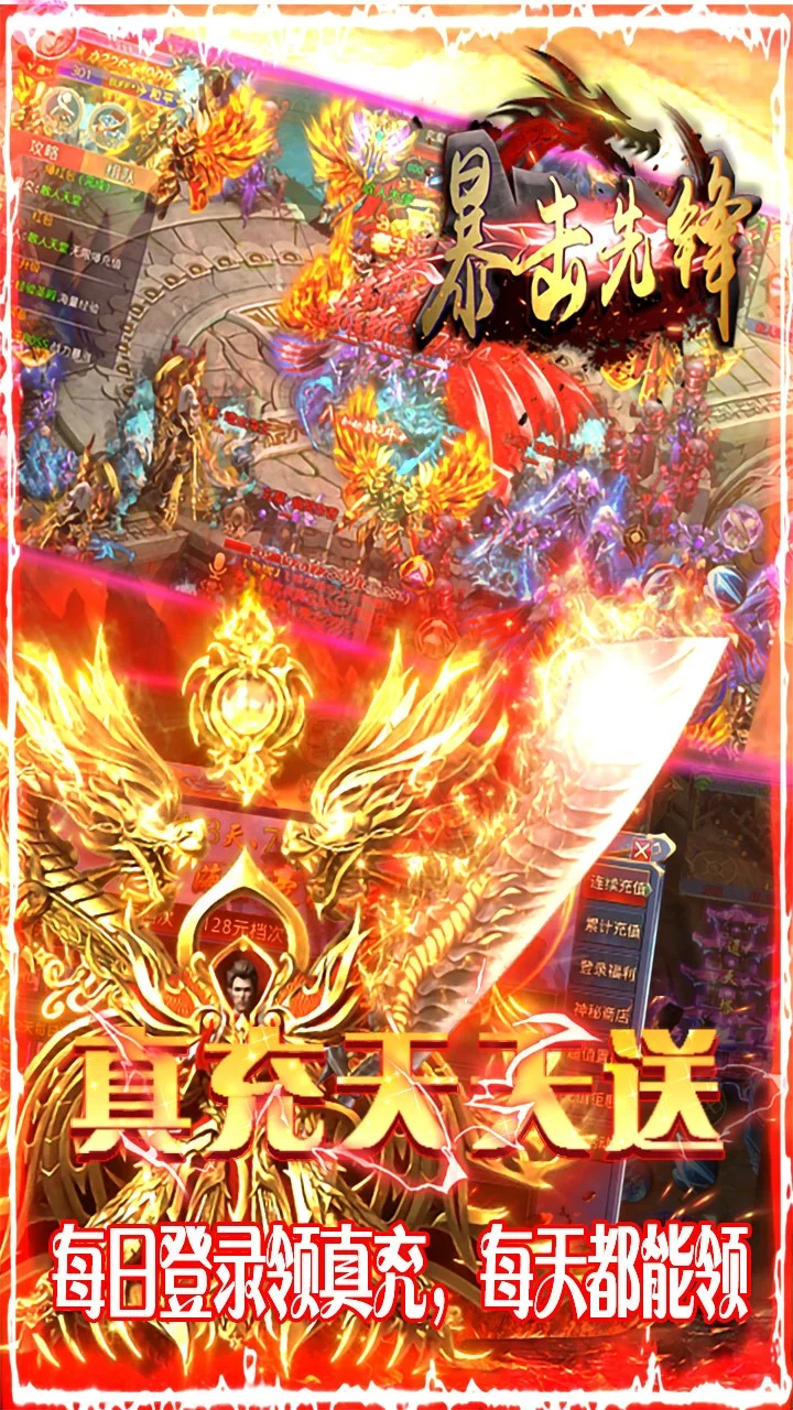 暴击先锋(爆千万真充)是一款全新的爆款传奇手游,上线即送vip15,开局即领88万钻石,888万元宝,创角直升三百级,每日签到累计千元真充红包和百万钻石,全新版本玩法火热上线,任何道具低价随意购买。刷副本小怪超高概率爆真充,打BOSS更是必爆大额真充!超激爽的火爆传奇等你来战,快召集兄弟们一起称霸全服!
