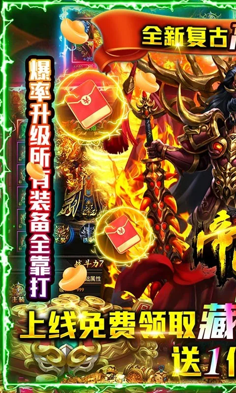经过研发团队精心打造的复古1.80《帝战(热血高爆版)》终于和大家见面啦,游戏根据端游1:1还原,带给你最逼真最极致的游戏体验,让你身临其境,自由PK,与兄弟们在热血沙场共赴传奇之约!更有超丰富的装备搭配和上百张地图,供您尽情遨游在刺激热血的玛法大陆!