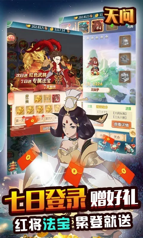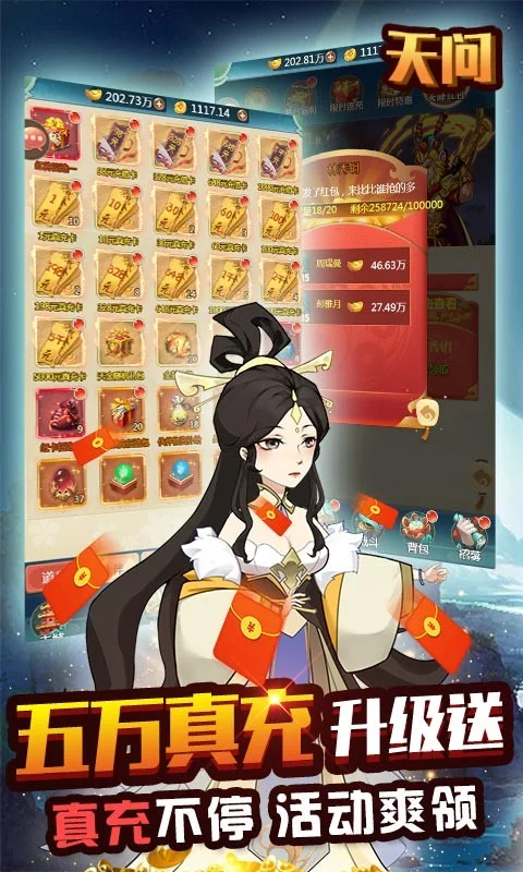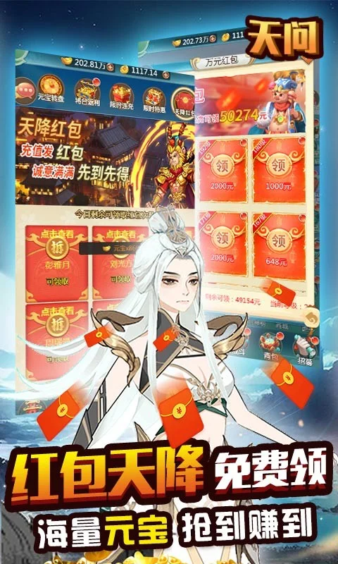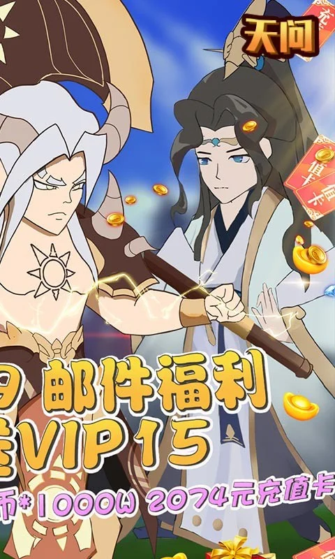 全新西游记卡牌大作——《天问》震撼来袭。游戏中的角色均来源于西天极乐世界中知名的神仙!采用多角色回合战斗玩法,宠物,坐骑,将台,神器,阵法,养成元素丰富多样、精心设计的角色技能配合缘分羁绊系统,让战斗更加灵活多变。上线就送VIP9,邮件奖励再送VIP15,元宝*188888,金币*1000W,更有2074元充值卡倾情相送;升级就送真充卡,累计可获得五万元;挂机爆真充,懒人福利,活动白嫖。超多福利活动,等来参与,还在等什么,一起加入我们吧!