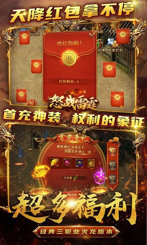 《怒战雷霆(双倍返利)》是一款原汁原味的传奇类手游,复古的人物模型、武器装备、BOSS带你回味1.80版本的盛世经典;全新的单职业战士集法师、道士技能于一身,给你无比爽快战斗体验;丰富的玩法,打不完的BOSS,极高的爆率让你能够在传奇的海洋里遨游。新增宠物系统能够让你打怪无忧,抢宝无虑。在游戏中不仅可以体验动作操作所带来乐趣,更精心设计了剧情引发玩家对人生的深入思考,使玩家体会团队协作的乐趣以及惩恶扬善的精神, 努力培养玩家良好的价值观和世界观。快带上小伙伴们一起来攻沙夺城吧!