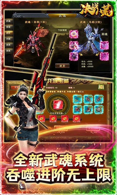 决战八荒送10万真充:赠送VIP10、50W钻石、10亿元宝、精武扬威体验皮肤;再送10万真充卡,增加对应钻石和至尊VIP经验,还可激活每天累充和福运累充,0充党福利正式来临!多种高爆地图,万物皆可爆,全程装备钻石回收,一夜暴富不是梦;全新武魂系统,吞噬进阶无上限,武魂幻化三国英雄人物,各领风骚。