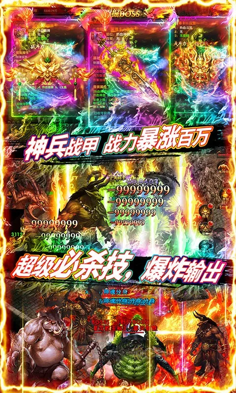 百倍爆率震撼来袭,上线2分钟直接打BOSS,击杀BOSS爆充值红包,一切装备道具都能爆,这里就没有你爆不出来的装备。还有炫酷超燃的技能特效,更有华丽时装,怪物超高爆率,神器战装满屏爆。 全新传奇手游力作,原汁原味的传奇玩法,手机版将传承端游的经典设置,一切装备道具均可打怪掉落外,自由PK、行会争霸以及沙巴克工程等传奇经典元素都将再手游中呈现!再加上精美又极具传奇风格的画面,力求为玩家打造指尖上真实震撼的战斗体验!