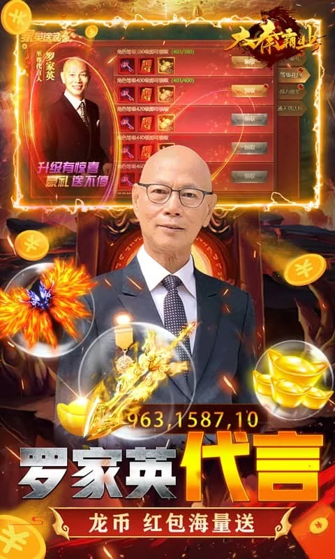 《大秦霸业(送万充终宠)》是一款经典传奇游戏,由罗家英倾情代言,送海量红包助力,免费领首充。上线领十万龙币,千万元宝。宠物直升终极,轻松打BOSS,高倍爆率,爆海量充值红包。游戏BOSS全部免费,无限畅打。轻松提升等级,领万元充值。更有丰富多彩的活动与副本玩法,提升个人体验与团队协作能力。