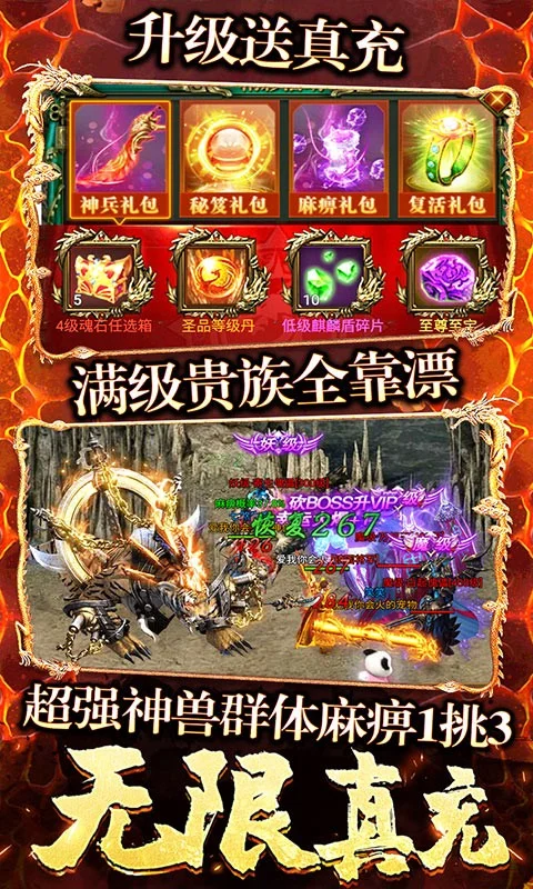 【决战八荒】游戏赠送128888钻石、188万元宝、贵族9,完成主线还可赠送首充礼包。技能超变合击版,完美复刻无限刀,天机老人无限白漂攻略,升级狂送现金红包,战力福利领无限红包。每日签到无限领真充红包,爆率大幅上调,装备全靠打